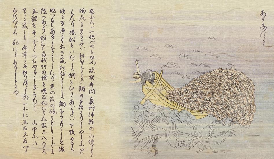 あかねずみ(赤鼠) 蜀山人が一話一言に曰く。延寶年間、奥州津軽の山頂より海原を見わたせば、おびたゞしく鰯のあつまりしやうに見えたり。漁船をいだして網をひきあぐれば、下腹の白く頭と脊通りは赤き鼠おびたゞしく網にかゝりしを、濱地へひきあげうちころしたり。其の鼠の殘りどもこと\゛/く陸へあがり、或ひは苗代、竹の根を喰ひ、或ひは在家へ入りて五穀をそこばくつひやす事かぎりなし。山中へ入りたる鼠ども、毒草こそありつらめ、一所に五百三百づゝかさなりて死にてありしとかや。